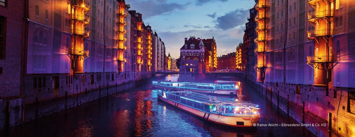 Erleben Sie die illuminierte Speicherstadt und das Lichtermeer im abendlichen Hamburger Hafen.